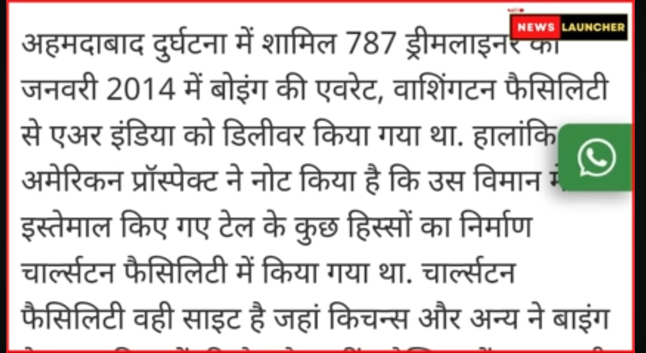 अमेरिकन ‘Prospect’ च्या अहवालानुसार, २००९ ते २०१६ दरम्यान ‘किचन्स’ नावाच्या महिला अधिकार्यांनी गुणवत्ता तपासणी दरम्यान गंभीर दोष निदर्शनास आणले होते. हे विमान, जे भारतात अपघातग्रस्त झाले, ते २०१४ मध्ये ‘वॉशिंग्टन फॅसिलिटी’तून एअर इंडियाला देण्यात आले होते. या विमानाच्या शेपट्याची (तेल) निर्मिती ‘चार्ल्सटन’ फॅसिलिटीमध्ये झाली होती, जिथे गुणवत्ता नियंत्रणावर वारंवार आरोप झाले होते.जे सहा विमाने ‘बोईंग’ कंपनीने स्वतः वापरण्याच्या लायकीची मानली नाहीत, ती विमाने भारतात विकली गेली, ही अत्यंत गंभीर बाब आहे.भारत हा प्रगतिशील राष्ट्र आहे. पण जेव्हा आपल्या देशात अशा जुनाट आणि दोषपूर्ण वस्तू विकल्या जातात, तेव्हा ही स्थिती आपल्यासाठी अपमानास्पद ठरते. ‘अपाचे’ हेलिकॉप्टर्सच्या बाबतीतही अशीच स्थिस्ती आहे त्यांच्या अपघाताची दुर्दैवी मालिका सुरू आहे.