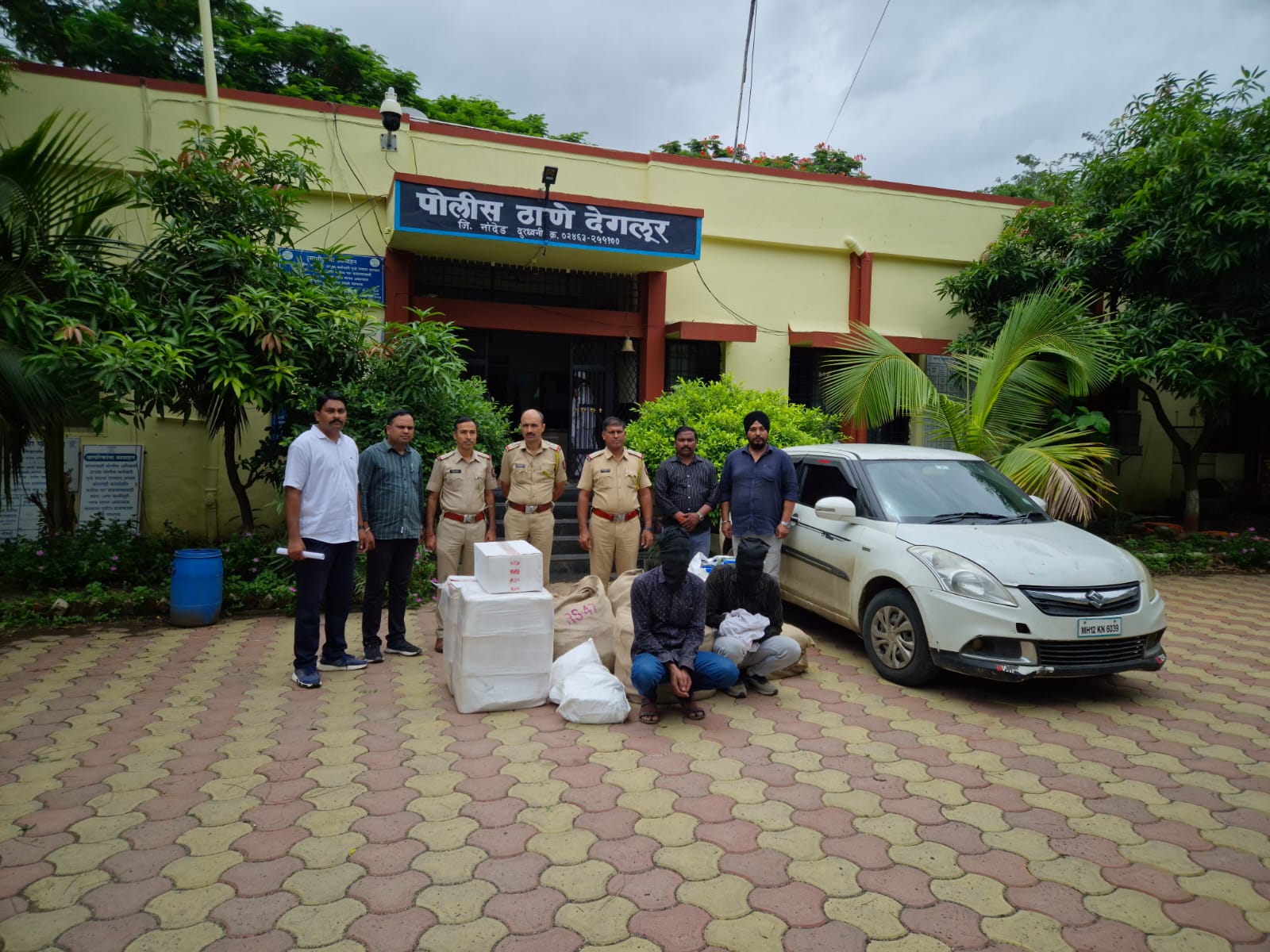 पोलीस अंमलदार राजवंतसिंघ बुंगई यांनी दिलेल्या तक्रारीनुसार देगलूर पोलीस ठाण्याचे पोलीस निरिक्षक मारोती मुंडे यांच्या मार्गदर्शनात गुन्हे शोध पथकातील पोलीस अंमलदार कृष्णा तलवारे, वैजनाथ मोटारगे, साहेबराव सगरोळीकर, रणजित मुजिदार हे दि.30 जून रोजी रात्री 9 वाजेच्यासुमारास गस्त करत असतांना चार चाकी गाडी क्रमांक एम.एच.12 के.एन.6039 ची तपासणी केली. त्यामध्ये शेख साजिद शेख जलाल बागवान (38) रा.हिंगोली आणि शेख अख्तर शेख गफार बागवान (33) रा.हिंगोली असे दोन जण बसलेले होते. गाडीची तपासणी केली तेंव्हा शासनाने प्रतिबंधित केलेला सुगंधीत विमल पान मसाला, रजनिगंधा पान मसाला, सिग्नेचर फाईनेस्ट पान मसाला, व्ही-1 बीग सुगंधीत टोबॅको असे अनेक प्रकार सापडले. त्या सर्वांची किंंमत 3 लाख 20 हजार 400 रुपये आहे. सोबतच चार चाकी गाडी 6 लाख रुपयांची असा 9 लाख 20 हजार 400 रुपयांचा मुद्देमाल जप्त करण्यात आला आहे. देगलूरचे पोलीस उपअधिक्षक संकेत गोसावी यांनी देगलूर पोलीसांचे कौतुक केले आहे.