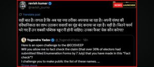 योगेंद्र यादव यांच्या सोशल मीडियावरील पोस्टमुळे त्यांना मोठे जनसमर्थन मिळाले आहे. हा प्रश्न बिहारमधील गरीब, मजूर व छोट्या समुदायांतील नागरिकांच्या मताधिकाराचा आहे. त्यांनी निवडणूक आयोगाने ‘फॅक्ट चेक’ पथक नेमावे, अशीही मागणी केली आहे.पत्रकार रविश कुमार यांनीही यादव यांच्या मुद्द्यांना पाठिंबा दिला आहे. त्यांनी म्हटले आहे की, संवैधानिक संस्थेच्या नावावर लोकांचे तोंड बंद केले जात आहे. अर्ज भरलेल्यांची यादी सार्वजनिक होऊन त्याची सत्यता पडताळली पाहिजे, पण हे कोण करणार, असा प्रश्न त्यांनी उपस्थित केला आहे.ते पुढे म्हणतात की, बिहारमधील किती लोकांकडे SSC प्रमाणपत्र, पासपोर्ट, जमीन दस्तऐवज किंवा सरकारी नोकरी आहे, याचा विचार केला तर मतदारसंख्येतून मोठा वर्ग वगळला जाऊ शकतो. आयोग म्हणतो २०% मतदार कमी होतील, पण हा खेळ पाहता असे वाटते की ८०% लोक मतदानापासून वंचित राहतील.