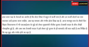या निवडणुकीसाठी बनावट प्रक्रिया राबवली जात असून, प्रत्यक्षात निकाल लागतील आणि 242 पैकी 240 जागा एका NDA पक्षाला मिळतील, असा दावा तेजस्वी यांनी केला. विधानसभेत आणि लोकसभेत विरोधकांना बोलू दिले जात नाही, निवडणुका हायजॅक केल्या जात आहेत, असे आरोप सातत्याने होत आहेत.