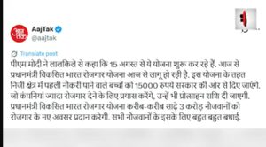 स्वातंत्र्याचा ७९ वा वर्धापन दिन साजरा करताना पंतप्रधान नरेंद्र मोदी यांनी जनतेला एक नवीन “चॉकलेट” दिलं. २०१४ मध्ये सत्तेवर येण्याआधी अमित शहा यांनी सांगितलं होतं की प्रत्येक भारतीयाच्या खात्यात १५ लाख रुपये जमा होतील. पण आज नरेंद्र मोदींनी सांगितलं की सार्वजनिक क्षेत्रात पहिली नोकरी मिळालेल्या युवकांना ‘पंतप्रधान विकसित भारत रोजगार योजना’अंतर्गत १५,००० रुपये दिले जातील.‘आज तक’ या वृत्तवाहिनीने दिलेल्या माहितीनुसार, १५ ऑगस्टपासून ही योजना लागू करण्यात आली असून, खासगी क्षेत्रात पहिली नोकरी मिळवणाऱ्या युवकांनाही याचा लाभ दिला जाईल. तसेच, ज्या कंपन्या रोजगार उपलब्ध करून देतील, त्यांनाही प्रोत्साहनपर रक्कम दिली जाणार आहे. सरकारच्या मते, या योजनेद्वारे जवळपास तीन कोटी युवकांना रोजगार मिळेल.