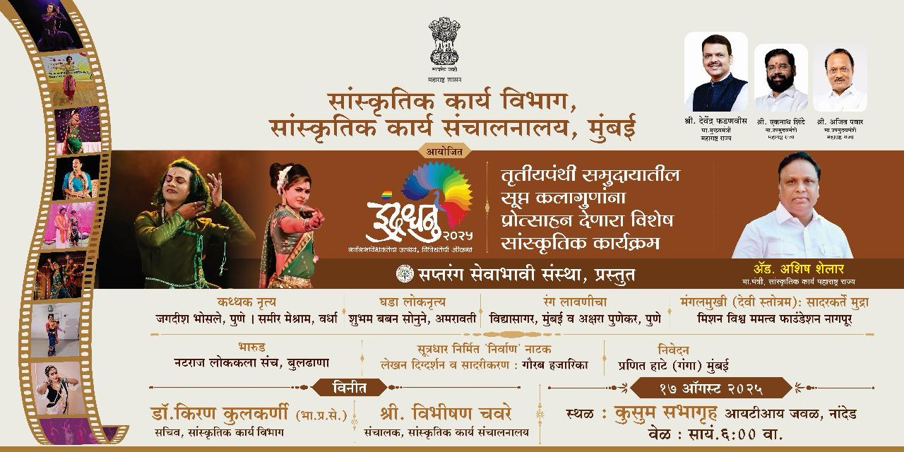 नांदेड  : –महाराष्ट्र शासनाच्या सांस्कृतिक कार्य विभागांतर्गत सांस्कृतिक कार्य संचालनालय, मुंबई व सप्तरंग सेवाभावी संस्था यांच्या संयुक्त विद्यमाने आयोजित ‘इंद्रधनू २०२५’ हा तृतीयपंथी विशेष सांस्कृतिक महोत्सव रविवार १७ ऑगस्ट २०२५ रोजी सायंकाळी ६ वाजता कुसुम सभागृह, नांदेड येथे पार पडणार आहे.