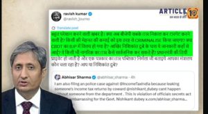 पत्रकार अभिसार शर्मा यांनी या प्रकरणावर तीव्र प्रतिक्रिया दिली असून निर्मला सीतारामन यांना उद्देशून विचारले आहे. “तुमचं मंत्रालय चालवतंय कोण , तुम्ही की खासदार दुबे?” त्यांनी ट्विटमध्ये म्हटले आहे की, “हा ट्विटरवरचा ड्रामा सुरू ठेवणाऱ्यांना खूश करण्याचा प्रयत्न आहे का?” तसेच त्यांनी निशिकांत दुबे आणि आयकर विभागाविरुद्ध गुन्हा दाखल करण्याची घोषणाही केली आहे.पत्रकार रविश कुमार यांनीही या प्रकारावर नाराजी व्यक्त केली आहे. त्यांच्या म्हणण्यानुसार, “पंतप्रधान मोदी यांची पदवी खाजगी असू शकते, पण एका पत्रकाराचा ITR सार्वजनिक? हे कसं चालेल?” त्यांनी यावर प्रश्न उपस्थित केला आहे की, “आता BJP पत्रकारांचे ITR उघड करून त्यांना टार्गेट करणार का?” त्यांच्या मते, हे अत्यंत त्रासदायक आणि चिंताजनक आहे.