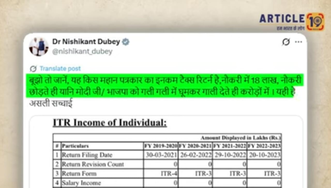 पत्रकाराची बेअब्रू करण्यासाठी भारतीय जनता पक्षाचे खासदार निशिकांत दुबे यांनी जे कृत्य केले, ते अत्यंत गंभीर आणि निषेधार्ह आहे. त्यांनी केवळ केंद्रीय अर्थमंत्री निर्मला सीतारामन यांची प्रतिमा मलीन केली नाही, तर पंतप्रधान नरेंद्र मोदी यांचीही अप्रत्यक्षपणे बेअब्रू केली आहे. शिवाय, स्वतःच्या वागणुकीचा बुरखा फाडण्यासाठी एक नवीन मार्ग तयार केला आहे.प्रश्न असा निर्माण होतो की, खासदार निशिकांत दुबे हे हे सर्व कोणाच्या इशाऱ्यावर करत आहेत? जर ते वित्तमंत्री आणि पंतप्रधानांबद्दल अशा पद्धतीने वादग्रस्त वागणूक देत असतील, तर त्या मागे कोण आहे, हे शोधणे हा एक मोठा संशोधनाचा विषय आहे.आर्टिकल 19 चे नवीन कुमार यांनी वाचकांना आवाहन केले आहे की, जर निशिकांत दुबे हे कोणाच्या सांगण्यावरून हे करत असतील, तर त्या व्यक्तीचे नावही जनतेसमोर यायला हवे.निशिकांत दुबे यांनी भारतीय आयकर कायद्याचा आणि ‘ऑफिशियल सिक्रेट्स अॅक्ट’चा संपूर्ण अपमान केला आहे. त्यांनी केंद्रीय वित्तमंत्री निर्मला सीतारामन यांचा उल्लेख करत एका पत्रकाराचा इन्कम टॅक्स रिटर्न (ITR) सार्वजनिकरित्या शेअर केला आहे. त्यांनी आपल्या ट्विटर हँडलवर त्या कागदपत्रांचे फोटो शेअर करत लिहिले आहे, “ओळखा, कोणत्या महान पत्रकाराचा हा ITR आहे? नोकरी करताना १८ लाख कमावले, नोकरी सोडल्यानंतर नरेंद्र मोदी आणि भाजपला गल्लीगल्ली फिरून शिव्या देत करोडपती झाले ,हीच आहे खरी पत्रकारिता!”