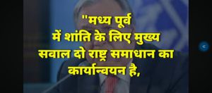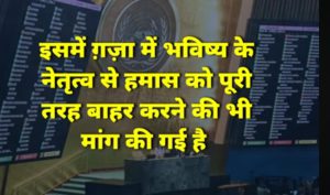 संयुक्त राष्ट्र संघात असा प्रस्ताव आला होता की, तो वाचकांनी समजून घेणे आवश्यक आहे. शुक्रवारी 11 सप्टेंबर 2025 रोजी हा प्रस्ताव आला होता. संयुक्त राष्ट्र महासचिव एंटोनियो बुटरेज म्हणाले मध्यपुर्व आशियाखंडात शांतीसाठी या दोन राष्ट्रांमध्ये समाधान अंमलात येणे महत्वपुर्ण आहे. जेथे दोन स्वतंत्र आणि संप्रभु तसेच लोकशाही प्रणालीला महत्व देत त्यांनी सोबत राहावे. दोघांमध्ये शांती आणि सुरक्षा हा महत्वाचा विषय आहे. 7 पानांच्या या प्रस्तावात गजामध्ये युध्द समाप्त करण्यासाठी सामुहिक एकजुट गरजेचे असल्याचे सांगण्यात आले आहे. त्यामुळे न्यायपुर्वक आणि शांतीपुर्ण समाधान निघेल. भविष्यातील नेतृत्वात हामासला बाहेर करण्याची मागणी आहे. तसेच हामासचा सर्व प्लॅलेस्टाईन गटांनी आव्हाण करण्यात आले आहे की, त्यांनी आपली हत्यारे समर्पित करावी. जेणे करून त्यांच्यासाठी सुध्दा स्वतंत्र देश बनविण्याच्या मार्गावर दृढ काम होईल. तशी ही बातमी आनंदाची आहे आणि भारत देशाने त्या पक्षात मतदान केले आहे.