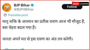 भाजपने तेजस्वी यादव यांना ‘कलयुगीं रावण’ असे संबोधले. प्रत्युत्तरादाखल, राष्ट्रीय जनता दलाने नितीश कुमार यांच्या वीस वर्षांच्या कार्यकाळातील सरकारला ‘रावणासारखे अहंकारी’ म्हटले आणि त्यांचा अंत आम्हीच करू असे जाहीर केले. भाजपने एका ट्विटमध्ये म्हटले की, “शक्तीचा अपमान करणाऱ्या रावणांचे प्रतीक आजही अस्तित्वात आहे, फक्त चेहरा बदलला आहे.” यासोबत पोस्टरवर लिहिले होते, “रावण प्रत्येक युगात होतो, पण चेहरा बदलत गेला.”
