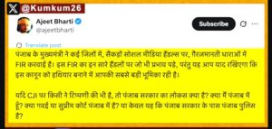 याच दरम्यान अजित भारती नावाच्या ट्रोल आर्मीतील सदस्याने, आणि त्याच्या समर्थकांनी सरन्यायाधीशांविरोधात अत्यंत अपमानास्पद भाषेत व्हिडीओ आणि पोस्ट्स टाकल्या. त्यामुळे भगवंत मान यांच्या सरकारने अजित भारतीसह शंभराहून अधिक सोशल मीडिया हँडल्सवर गुन्हे दाखल केले आहेत.अजित भारतीने या संपूर्ण कारवाईवर प्रतिक्रिया देताना पंतप्रधान मोदींना उद्देशून लिहिले की, “हा कायदा तुमच्यामुळे अस्तित्वात आला. मग पंजाब सरकारला अशा प्रकारची कारवाई करण्याचा अधिकार कसा? मी पंजाबमध्ये राहत नाही, न्यायालयही तिथे नाही.”तसेच, अजित भारती आता सुवर्ण आणि ब्राह्मण समाजाला एकत्र येण्याचे आवाहन करत आहे आणि सोशल मीडियावर त्याला मोठा पाठिंबा मिळतो आहे.