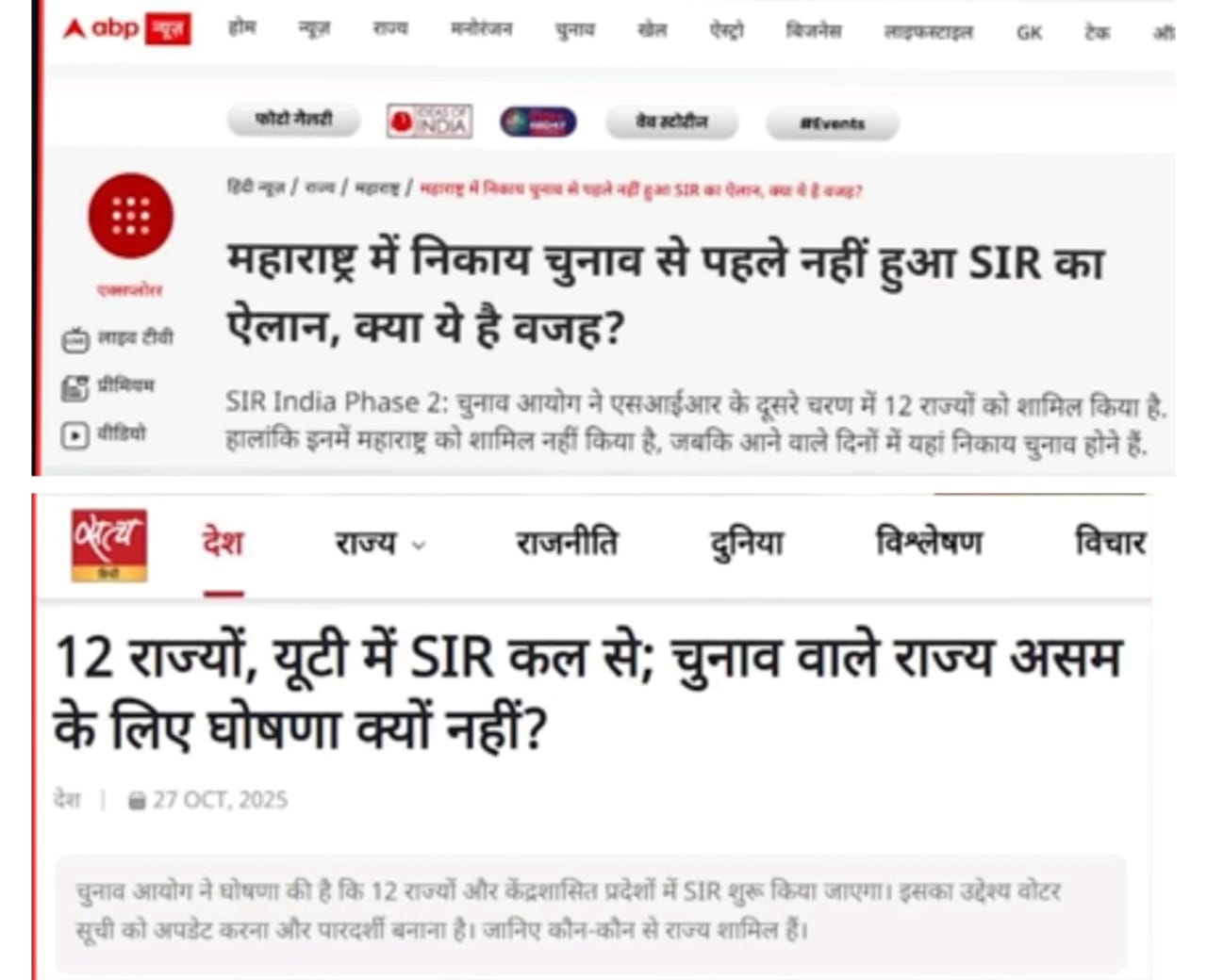 भारताचे मुख्य निवडणूक आयुक्त ज्ञानेश कुमार वर्मा आणि इतर अधिकाऱ्यांनी सोमवारी एक पत्रकार परिषद घेऊन बारा राज्ये आणि केंद्रशासित प्रदेशांमध्ये मतदार पुनर्निरीक्षण (SIR) ची घोषणा केली. त्यांनी सांगितले की ज्या राज्यांमध्ये 2026 मध्ये निवडणुका होणार आहेत, त्या राज्यांमध्ये ही कार्यवाही प्राथमिकतेने केली जाईल.2026 मध्ये आसाम राज्याचीही निवडणूक आहे, परंतु तेथे SIR घोषित करण्यात आलेले नाही. याचा अर्थ असा होतो का की ज्या राज्यांमध्ये भारतीय जनता पक्षाचे सरकार आहे, त्या राज्यांना वगळून SIR घोषित केले आहे? हीच का निवडणूक आयोगाची कार्यपद्धती आहे? आणि आयोग यापुढेही अशाच पद्धतीने काम करणार आहे का?आसाम राज्यात SIR का घोषित झाले नाही? आणि इतर राज्यांमध्ये ते का आवश्यक आहे? हा प्रश्न आम्ही वाचकांसाठी खुला सोडत आहोत.