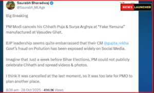 जगात आपली खिल्ली उडू नये म्हणूनच पंतप्रधान नरेंद्र मोदी यांनी हा कार्यक्रम रद्द केल्याचे सांगितले जात आहे. यमुनेच्या संदर्भात दिल्लीच्या मुख्यमंत्री रेखा गुप्ता यांनी केलेली “धोकेबाजी” सोशल मीडियावर उघड झाली. त्यामुळे वासुदेव घाटावरील हा कार्यक्रम रद्द करण्यात आला, असे आप पक्षाचे नेते सौरभ भारद्वाज यांनी ‘X’ या प्लॅटफॉर्मवर पोस्ट केले.