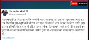 “भगवान सूर्यदेवाला सकाळच्या प्रहरात अर्घ्य देण्यापासून आज छठपूजेचा शुभारंभ झाला आहे. चार दिवसीय अनुष्ठानादरम्यान छठपूजा आपल्या भव्य परंपरेचे दर्शन घडवते. सर्व व्रतधारकांनी या पावन पर्वात सहभागी व्हावे. सर्वांना आणि त्यांच्या परिवारांना माझ्याकडून मनःपूर्वक शुभेच्छा! छठ मय्येच्या कृपेने सर्वांचे जीवन अलौकिक राहो.”