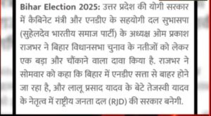 राजभर यांनी हेही म्हटले की त्यांनी हा डेटा गुगलवर तपासला असून, गुगलनेही तेच दाखवले. त्यामुळे, त्यांच्या मते, यंदाही जास्त मतदान म्हणजे महाआघाडीचा विजय.राजभर यांची नाराजी फक्त इतकीच नाही की बिहारमध्ये भाजप जिंकणार नाही, तर त्यांना बिहारमध्ये स्वतःच्या पक्षाला जागा मिळावी, अशी अपेक्षा होती. भारतीय जनता पक्षातील काही नेत्यांनी त्यांना उमेदवारीबाबत आश्वासन दिले होते, पण एनडीएच्या आघाडीत जागांचे गणित जुळत नसल्यामुळे त्यांना उमेदवारी मिळाली नाही. त्यामुळेच त्यांनी नाराजीच्या सुरात म्हटले होते की, “मी बिहारमध्ये ५२ जागांवर उमेदवार उभे करीन.” परंतु प्रत्यक्षात तसे काही घडले नाही आणि त्यांना शांत बसावे लागले.