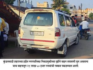 कुंडलवाडी (प्रतिनिधी)-कुंडलवाडी येथील जकात नाका येथे नगरपालिका निवडणुकीच्या अनुषंगाने एसएसटी पथकाची नियुक्ती करण्यात आली असून या ठिकाणी वाहनांची कसून तपासणी करण्यात येत आहे. यातच दि.12 नोव्हेंबर रोजी सायंकाळी 4 वाजता एका कारमध्ये 21 लाख 50 रुपयांची रक्कम एसएसटी पथकाने पकडली आहे. घटनास्थळी पोलीस अधीक्षक अबिनाश कुमार यांनी भेट दिली.