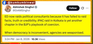 खरंच, केंद्रीय एजन्सी विरोधकांच्या दारात गेल्या की तपास, आणि विरोधकांनी एजन्सीला प्रश्न विचारले की गुन्हा! अखिलेश यादव सांगतात “भाजपला बंगालमध्ये हार दिसतेय.” तृणमूल म्हणते “लोकशाही आजारी, एजन्सी अॅक्टिव्ह!” भाजप म्हणते “सगळं कायदेशीर!” आणि देश पाहतोय कालचे भ्रष्टाचारी आज पवित्र, कालचे गुन्हे आज माफ, कारण ते सध्या ‘वॉशिंग मशीन’च्या योग्य साइडला आहेत! निवडणूक जिंकायची असेल तर नेते बदलतात, पक्ष फुटतात, आणि कंपनीवर छापे पडतात! एकूण काय तर, बंगालमध्ये लढत मतपेटीची कमी आणि एजन्सींची जास्तच दिसतेय. कारण सत्ता हवीच आहे मग ती सामाने येवो, दामाने येवो, दंडाने येवो, की भेदाने येवो!
