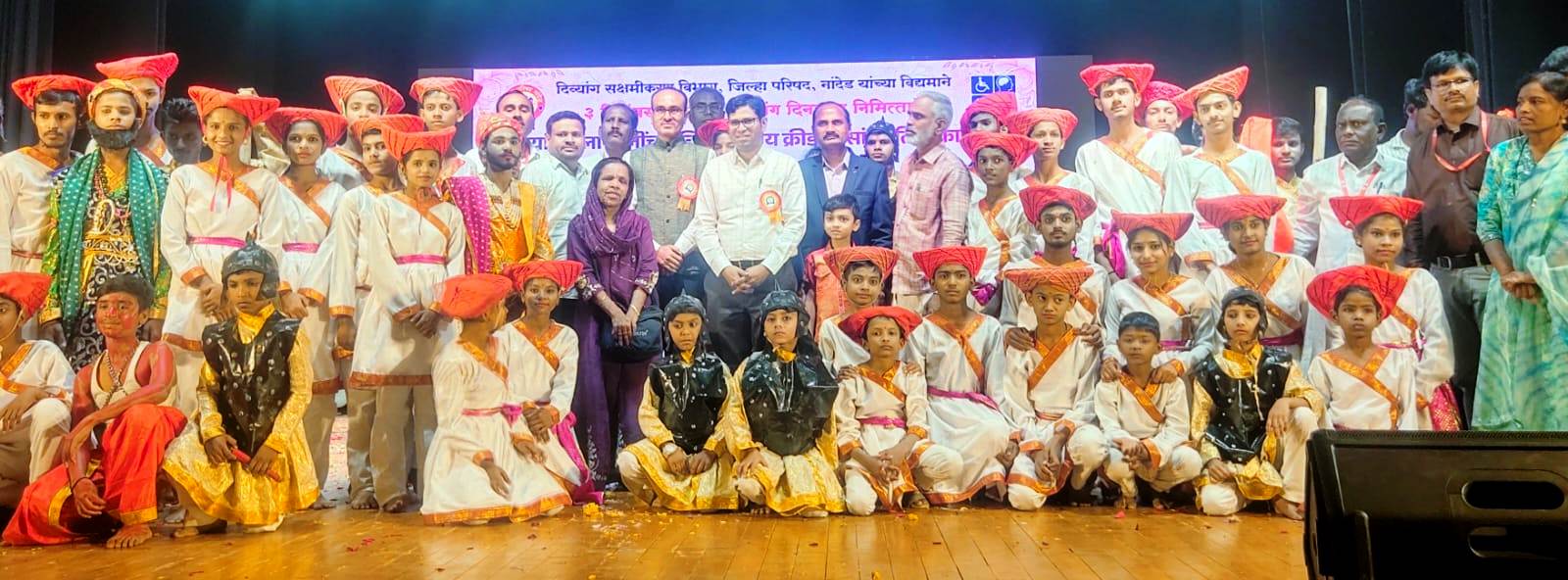 नांदेड – दिव्यांग कल्याण आयुक्तालय, जिल्हा परिषद नांदेड व जिल्हा दिव्यांग सक्षमीकरण विभाग यांच्या संयुक्त विद्यमाने जागतिक दिव्यांग दिनानिमित्त नांदेड येथील शंकरराव चव्हाण प्रेक्षागृहात भव्य व प्रेरणादायी सांस्कृतिक कार्यक्रमाचे आयोजन करण्यात आले. या कार्यक्रमात जिल्ह्यातील सुमारे ५८ मुकबधीर, अंध, मतिमंद व अपंग विद्यालयांमधील विद्यार्थ्यांनी सहभाग नोंदवत आपल्या कलागुणांचे सशक्त दर्शन घडविले.