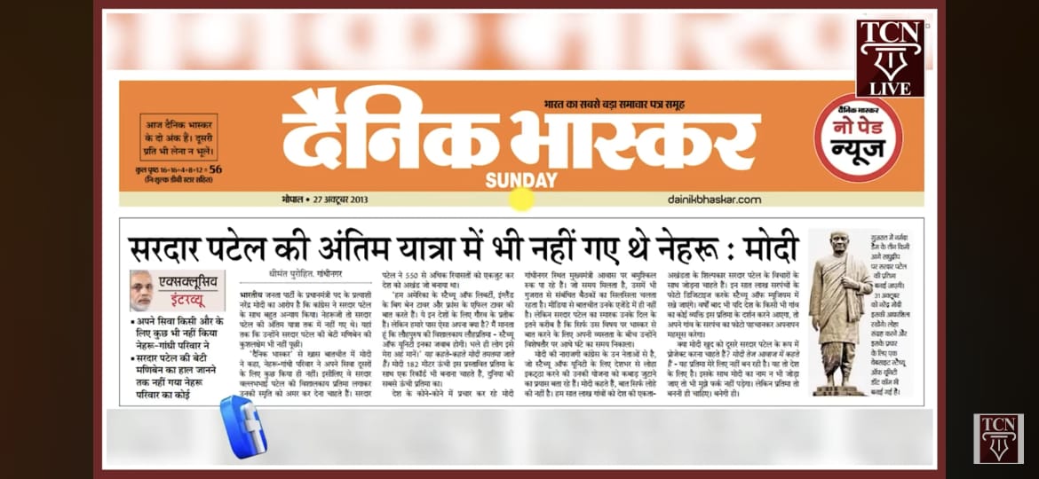सत्ताबदल होण्याआधी, 27 ऑक्टोबर 2013 रोजी दैनिक भास्करमध्ये छापलेली, आजचे पंतप्रधान नरेंद्र मोदी यांची मुलाखत पुन्हा पुन्हा व्हायरल केली जाते. त्यात असा दावा करण्यात आला की पंडित जवाहरलाल नेहरू सरदार पटेल यांच्या अंत्ययात्रेला गेले नव्हते. हे सरळसरळ खोटे आहे. तत्कालीन पंतप्रधान नेहरू अंत्ययात्रेला उपस्थित होते, याची बातमी त्या काळात टाइम्स ऑफ इंडियाने छापली होती. इतकेच नव्हे तर राष्ट्रपती डॉ. राजेंद्र प्रसाद सुद्धा त्या अंत्ययात्रेत सहभागी झाले होते. घटनात्मकदृष्ट्या राष्ट्रपतींचे जाणे अनुचित मानले जात असतानाही ते गेले हे दोघांमधील परस्पर आदर आणि आपुलकीचे द्योतक आहे.
