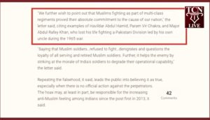 त्या पत्रात स्पष्टपणे सांगितले गेले की मुस्लिम सैनिकांवर संशय घेणारा प्रचार देशाच्या सुरक्षेसाठी घातक आहे. तो प्रचार सेवेत असलेल्या आणि सेवानिवृत्त सैनिकांच्या प्रामाणिकपणावर थेट हल्ला करतो आणि सैन्याचे मनोबल खच्ची करतो.